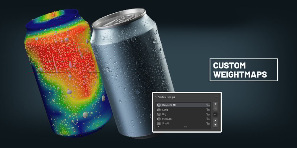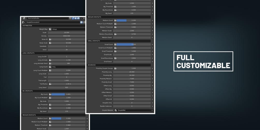 Using proximity between the droplets, all distribution happens without any unrealistic looking overlapping droplets. You can of course change the proximity value to your liking.