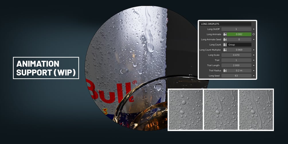 Bring life to your renders with animated long droplets, customize the shapes and make everything look more realistic. This feature is still in development, so currently it only works on flat surfaces.